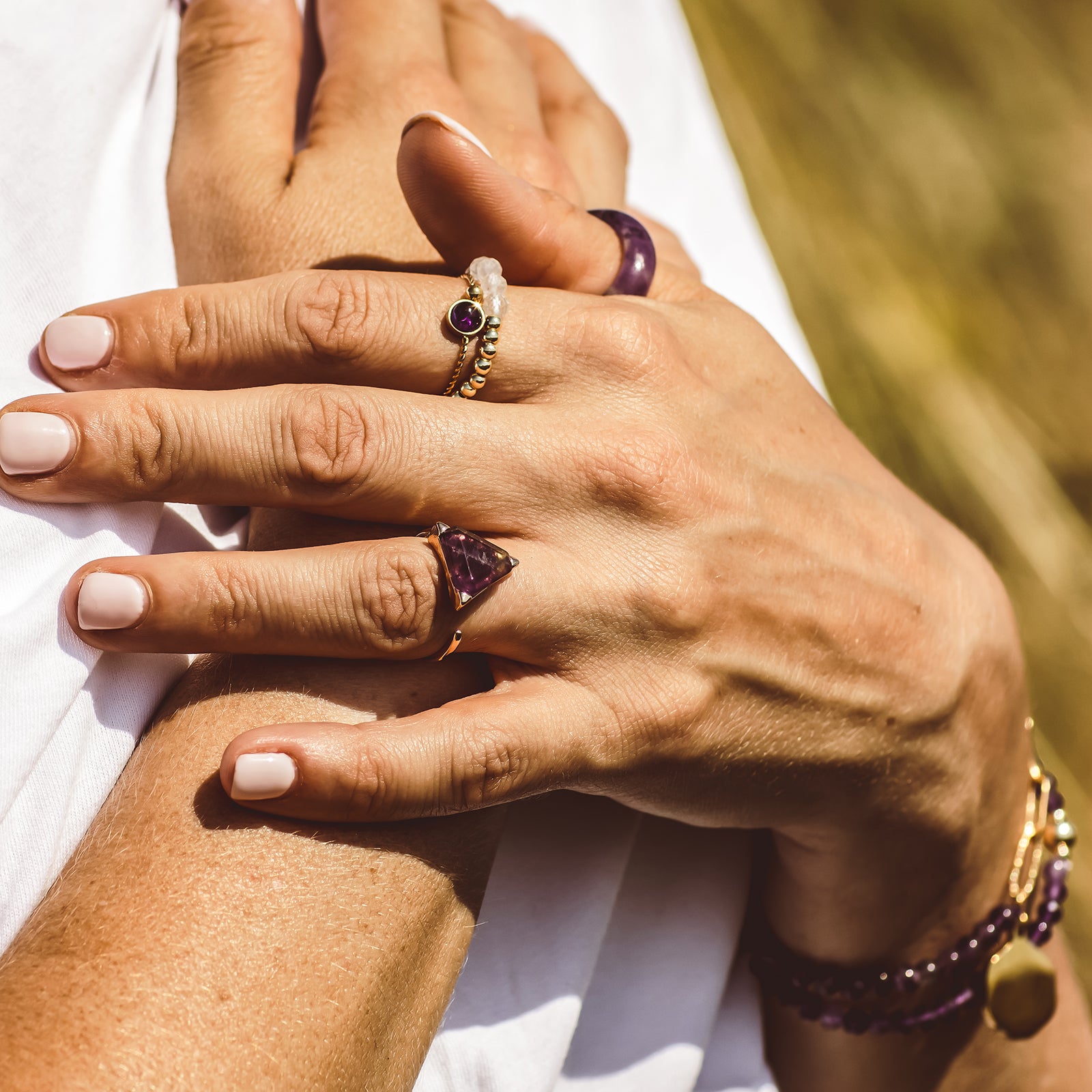 Amethyst 18K Plated Gold Ring ✺ A serene, protective stone known for enhancing intuition, mental clarity, and spiritual growth. Its soothing energy brings balance and calm, making it a meaningful piece for daily wear.