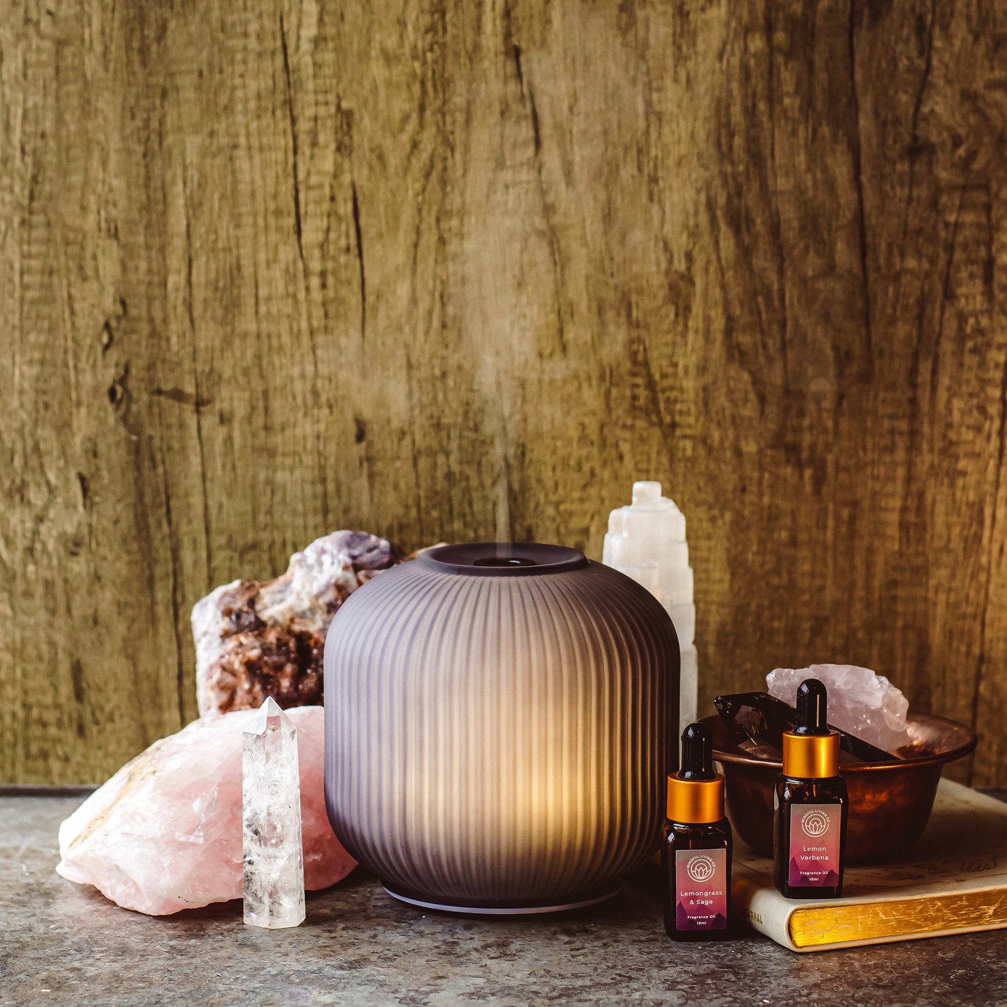 ✺ A refined fusion of modern design and calming aromatherapy. This elegant diffuser features a ribbed glass body that softly diffuses light while discreetly housing the water tank.
