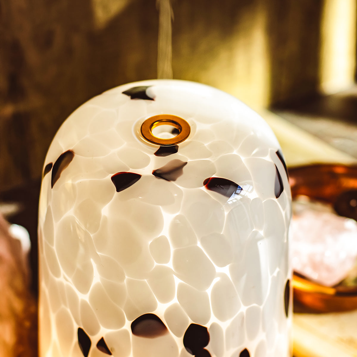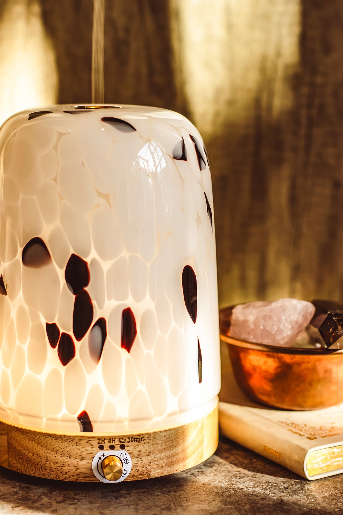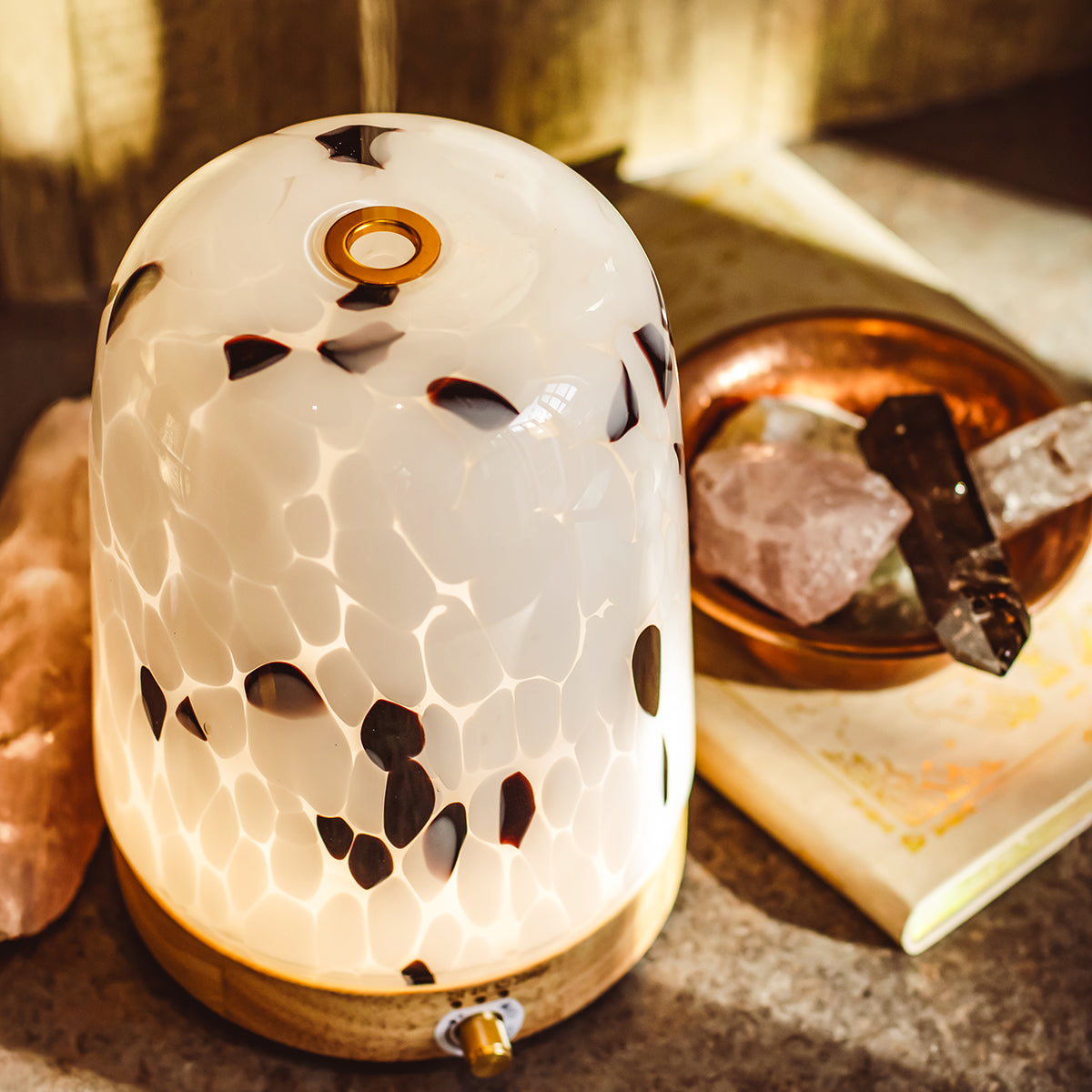 ✺ A calming blend of nature and elegance. This thoughtfully crafted diffuser features a handblown glass dome to soften the light and subtly conceal the water tank. A natural bamboo base grounds the design in earthy luxury, while brass buttons offer a refined finishing touch.
