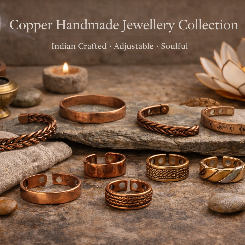 ✺ Crafted with intention, shaped by hand, and designed to move with you, our Indian copper handmade jewellery celebrates traditional metalwork and natural wellbeing. Each piece is individually formed using age-old artisan methods and finished with an adjustable fit for everyday comfort.