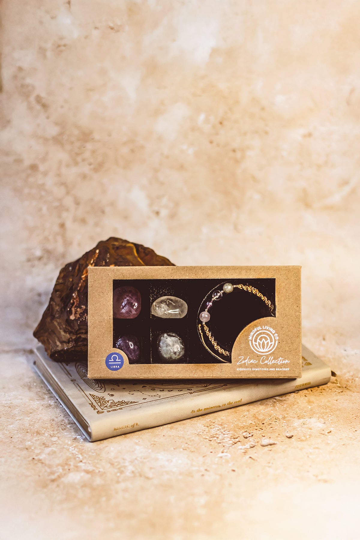 Celebrate the diplomatic, charming, and balanced nature of Libra (Sept 23–Oct 22) with this Zodiac Gift Set. Symbolized by the Scales, Libras are known for their desire for harmony, fairness, and their ability to bring people together. This set includes four large tumblestones carefully selected to enhance their natural traits, along with a complimentary Libra Zodiac Crystal Beaded Bracelet, designed to keep their energy close at all times.