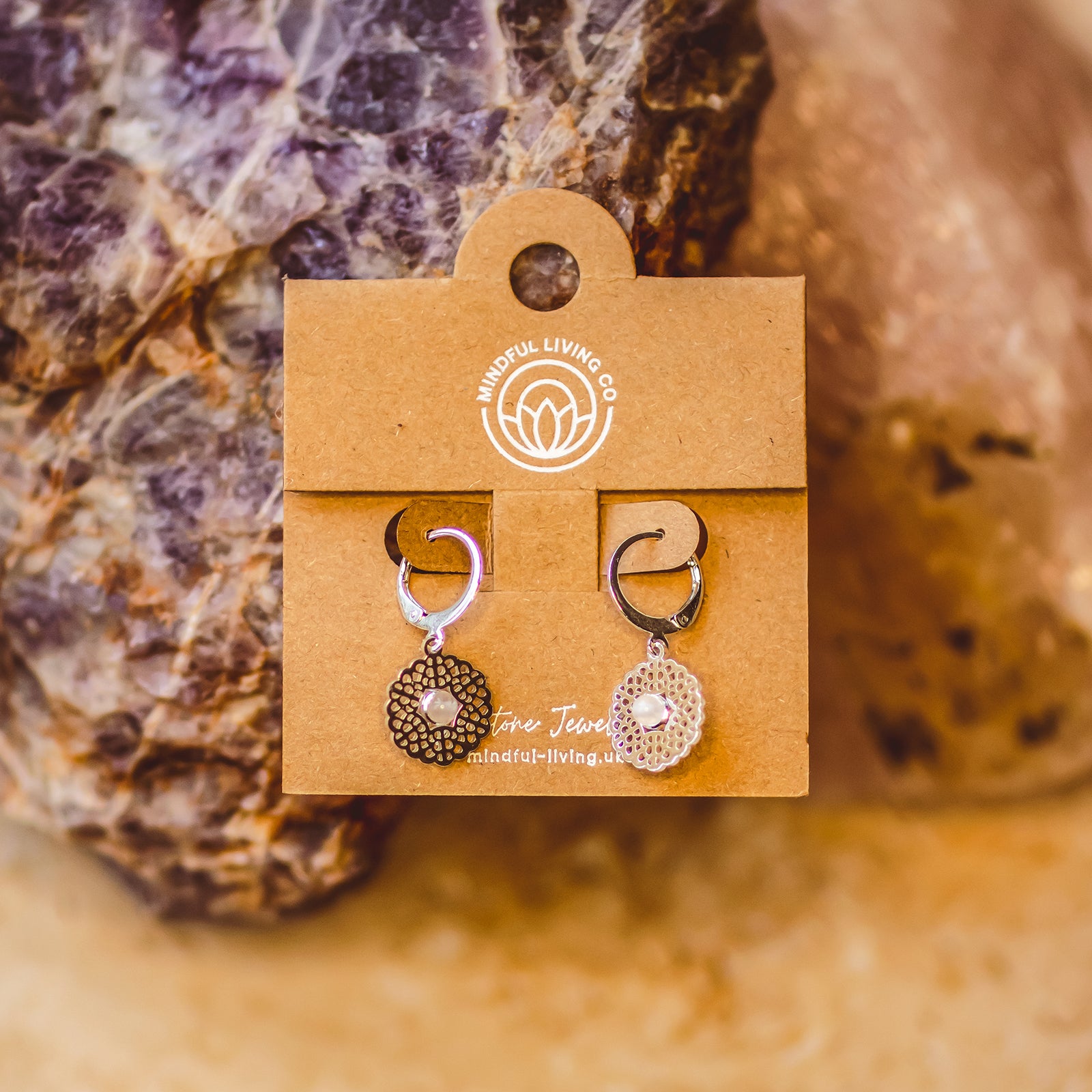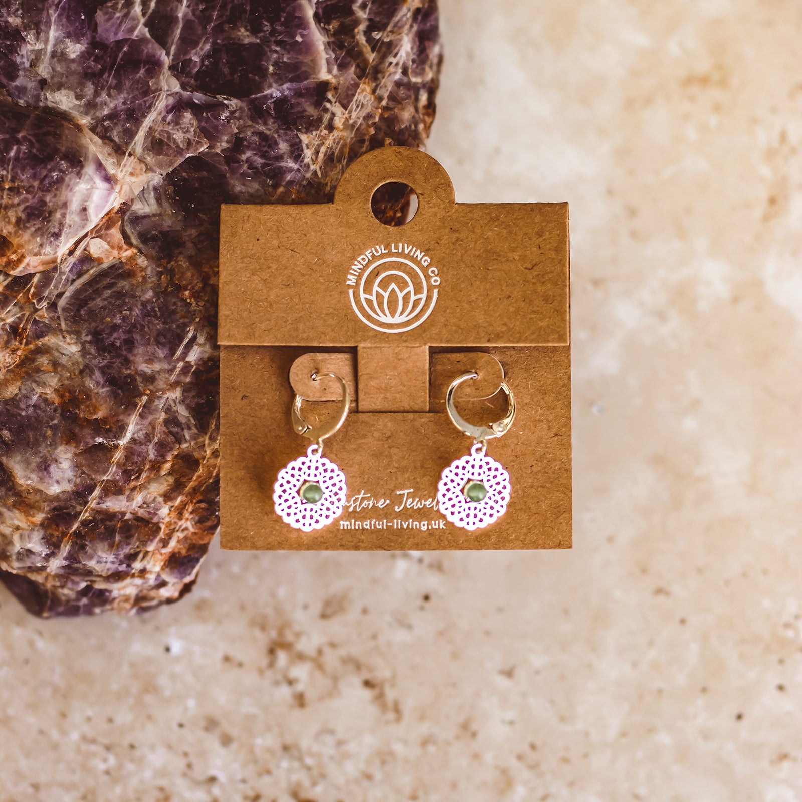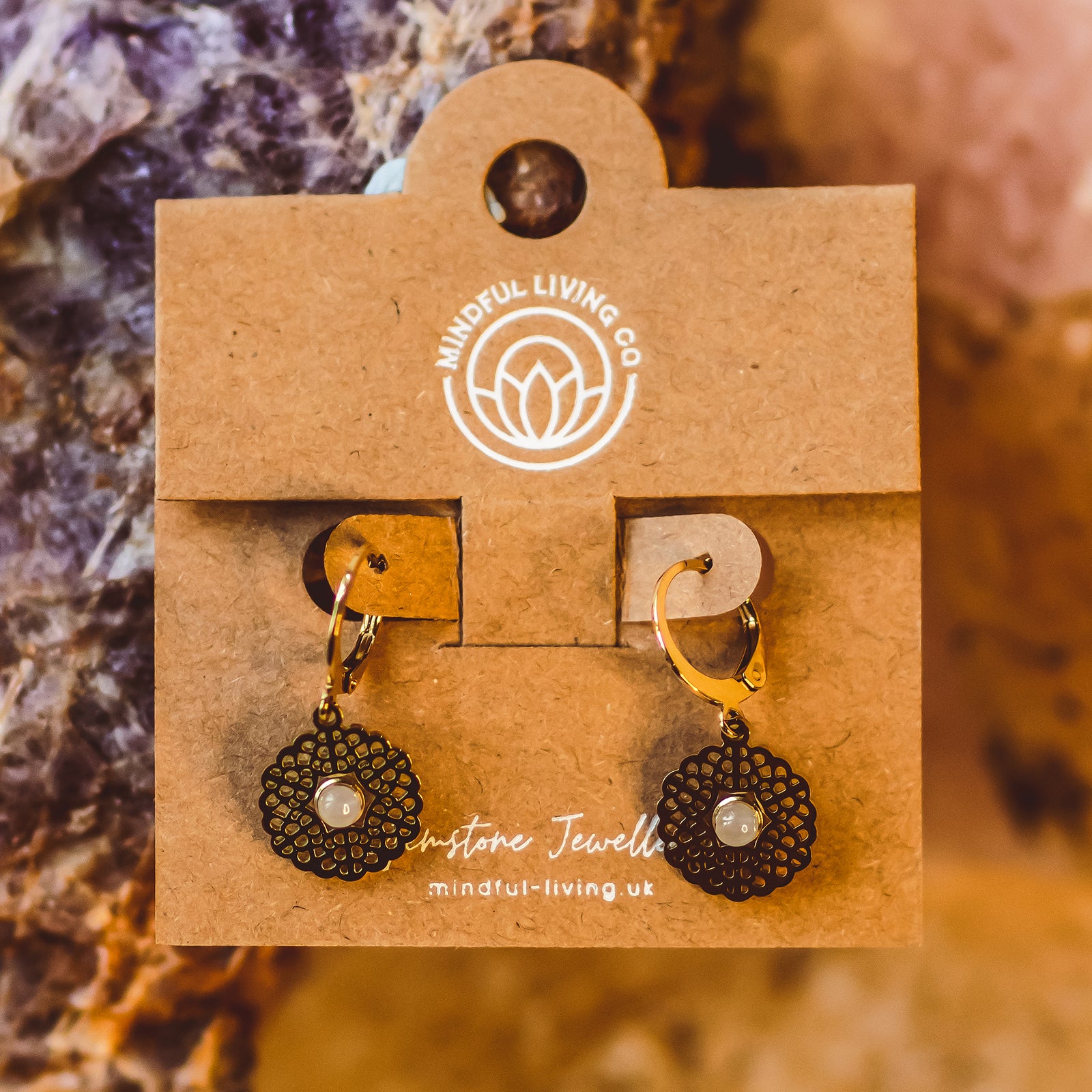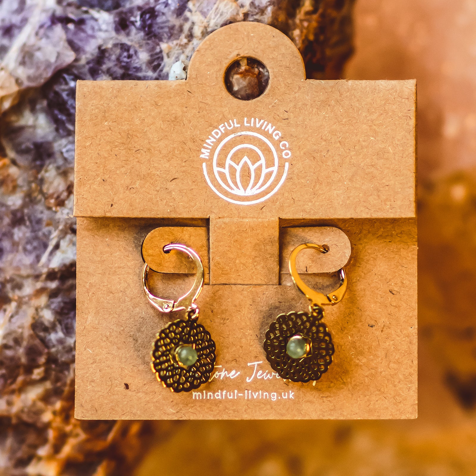 Mandala Gemstone Earrings ✺ A graceful collection of elegant drops, available in 18K gold or silver plating. Each earring features a hand-polished gemstone, radiating gentle energy and symbolising harmony to mirror the beauty of our mandala necklaces. Lightweight and timeless, they’re perfect for daily wear, spiritual gifting, or pairing with your favourite pendant.