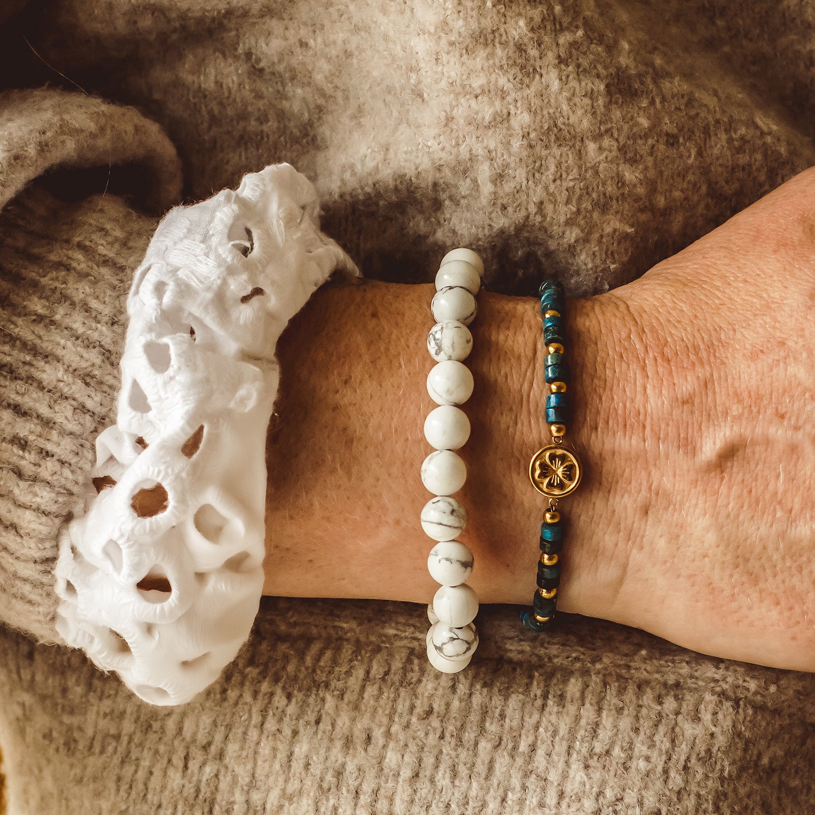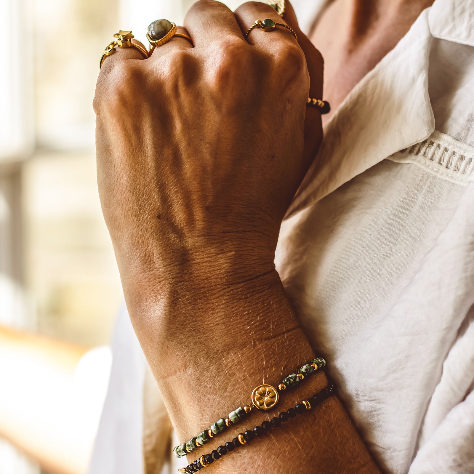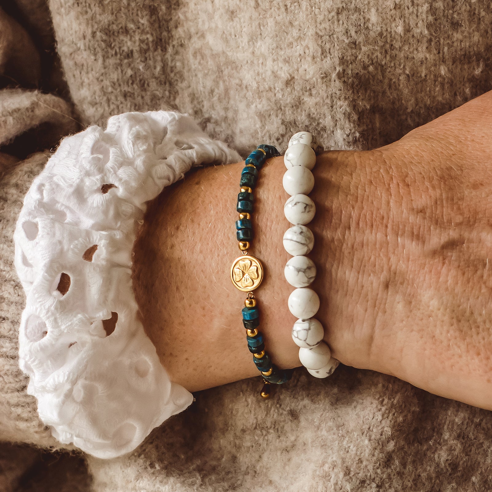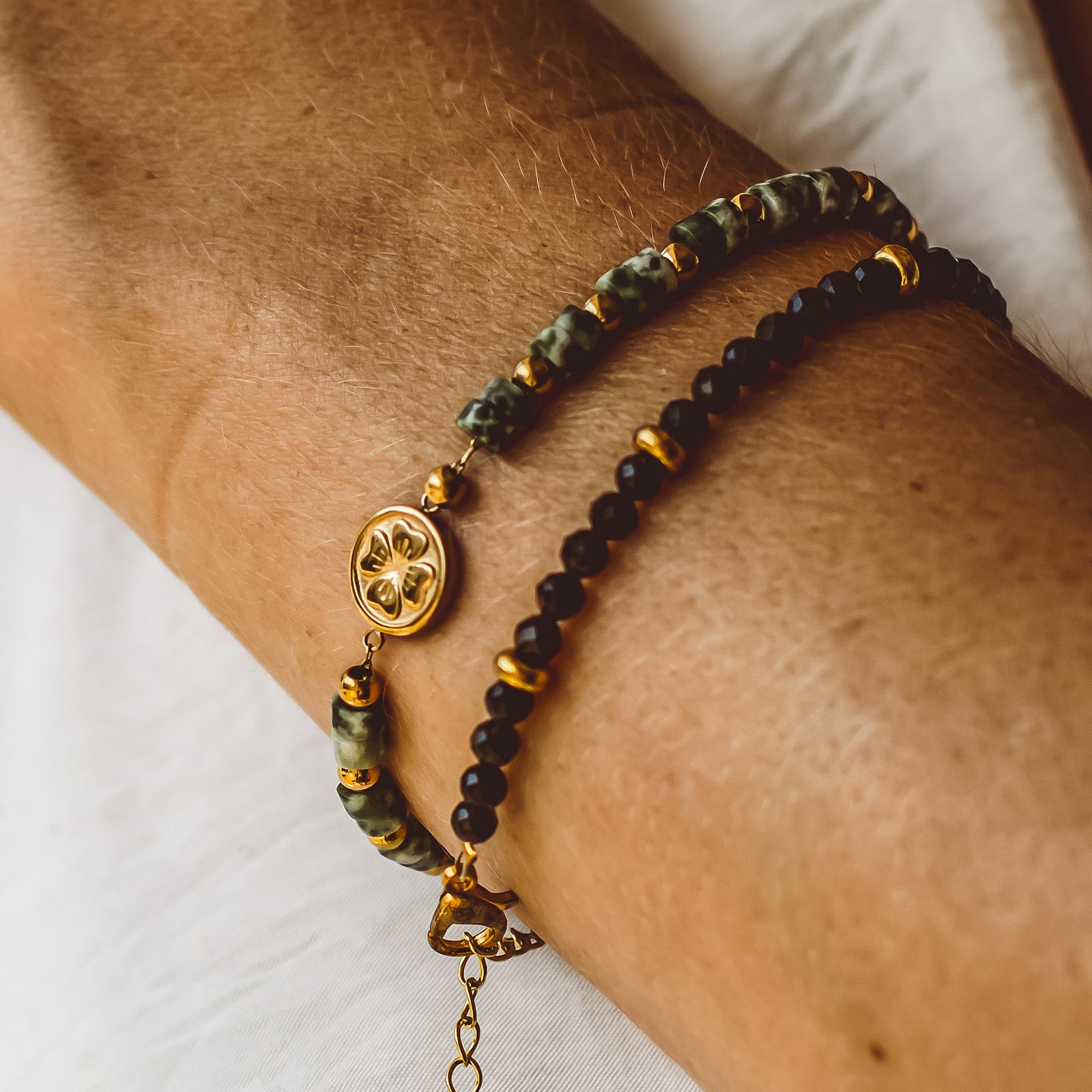 ✺ A meaningful trio of gemstone bracelets, each featuring polished cube-cut beads and our signature 18K gold-plated four-leaf clover charm — a timeless symbol of luck, hope and positivity.