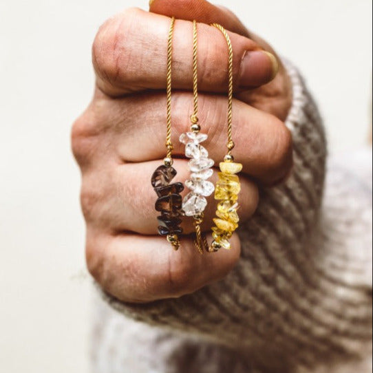 ✺ A soulful collection of bohemian-style bracelets, each featuring 7 genuine gemstone chips on a hand-knotted, adjustable brown cord.
