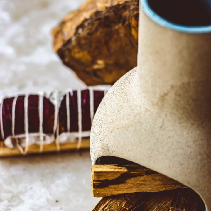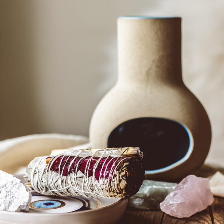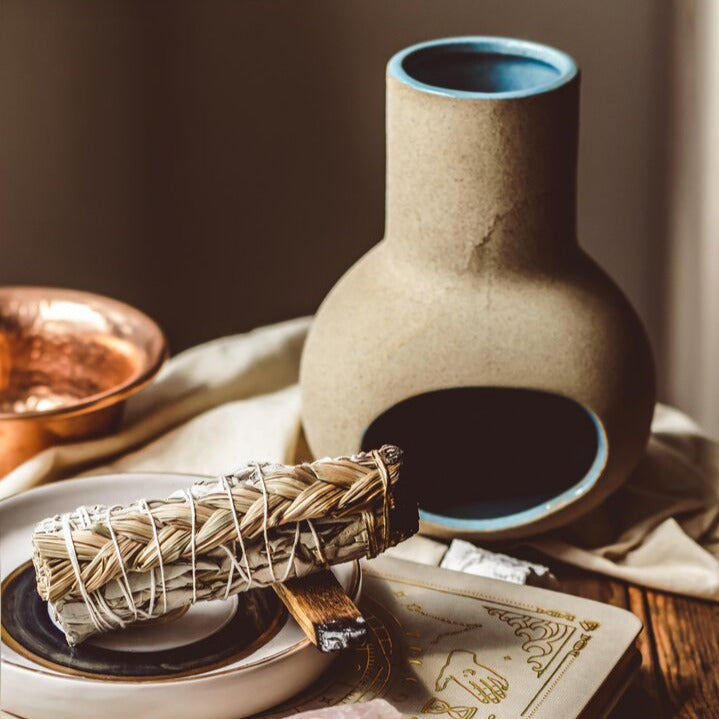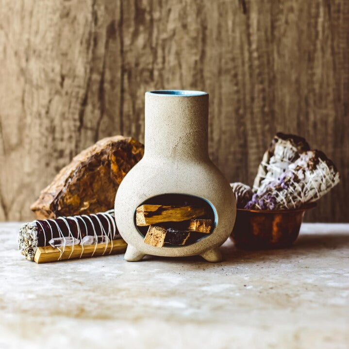 Crafted in small batches, this handcrafted mini chiminea blends natural charm with purposeful design. Each piece features a serene blue glazed interior, perfect for gently smouldering smudge sticks, palo santo, or incense cones. Ideal for sacred corners, or meditation spaces, it offers a safe, beautiful way to deepen your rituals and invite calm.