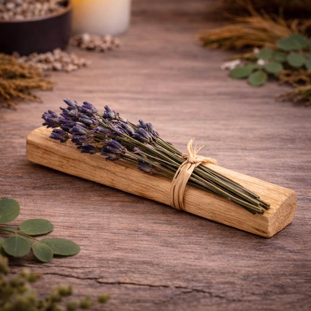 This uplifting mini smudge cluster pairs sacred Palo Santo with calming dried lavender, hand-tied for balanced cleansing and gentle restoration. Perfect for daily rituals, meditation spaces, or as a thoughtful wellness gift, it brings warmth, clarity, and tranquillity in a compact form.