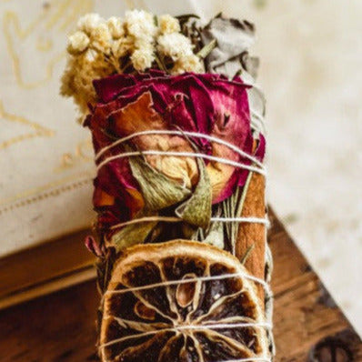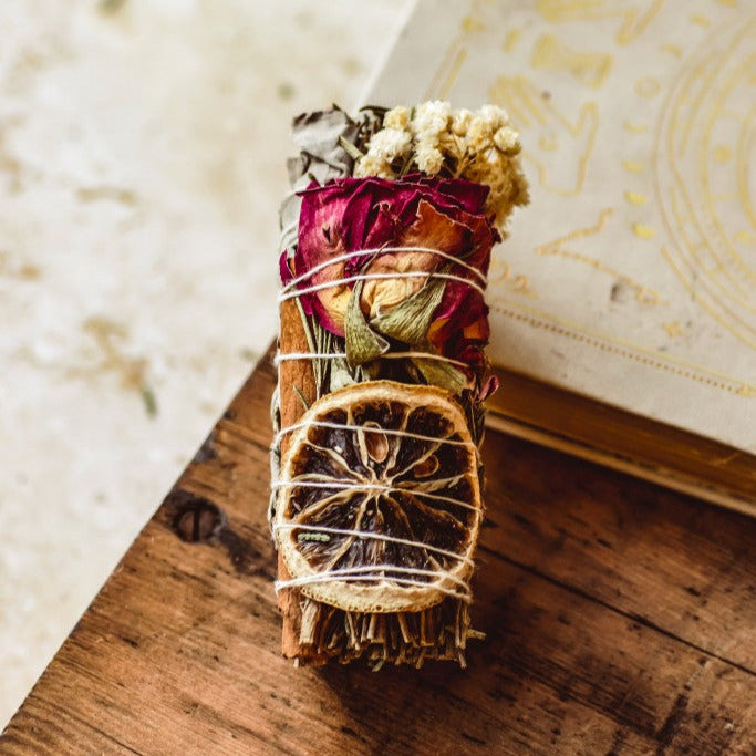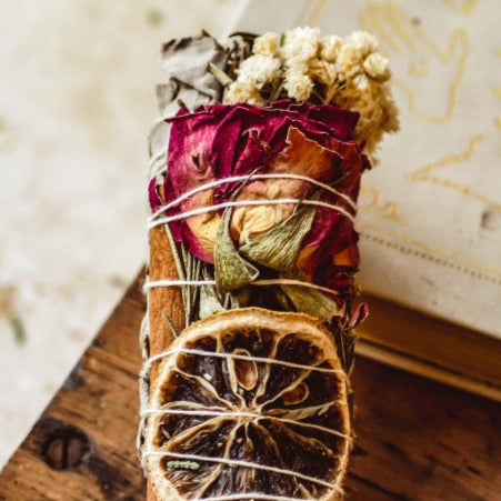 Dried lemon brings a bright, citrus lift—cleansing the aura and encouraging positivity. Baby’s breath softens the bundle visually and spiritually, symbolising purity, innocence and peace. Cinnamon adds a subtle sweet spice, known to attract abundance and warmth.